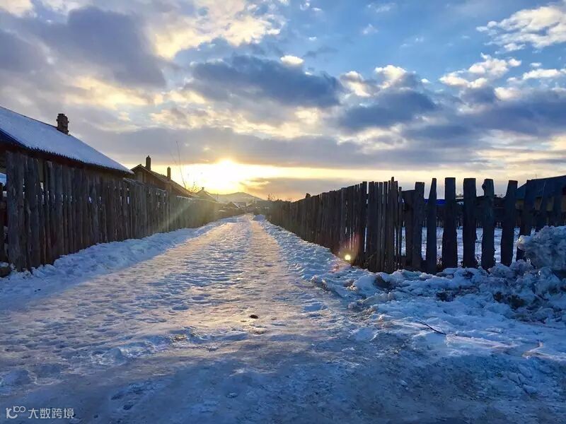 在中国大部分地区都被雨雪覆盖的时候,北极村却是阳光灿烂。夕阳下厚厚的积雪道路,衬着两边的木栅栏,仿佛能听到脚踩在上面吱吱的声响。