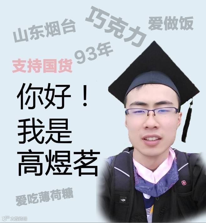 高煜茗,24岁,1993年出生于山东烟台海阳市,2016年毕业于青岛大学,电子商务专业,身高1.83米,体重130斤,爱吃薄荷糖,爱吃巧克力,喜欢做饭,爱国,支持国货