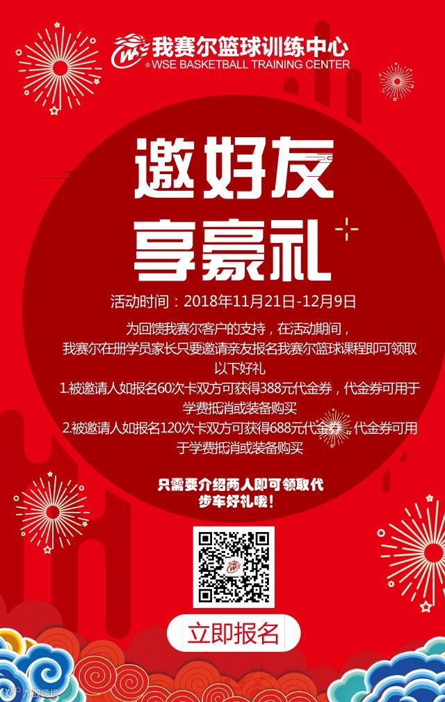 为回馈我赛尔客户的支持,在活动期间,我赛尔在册学员家长只要邀请亲友报名我赛尔篮球课程即可领取以下好礼