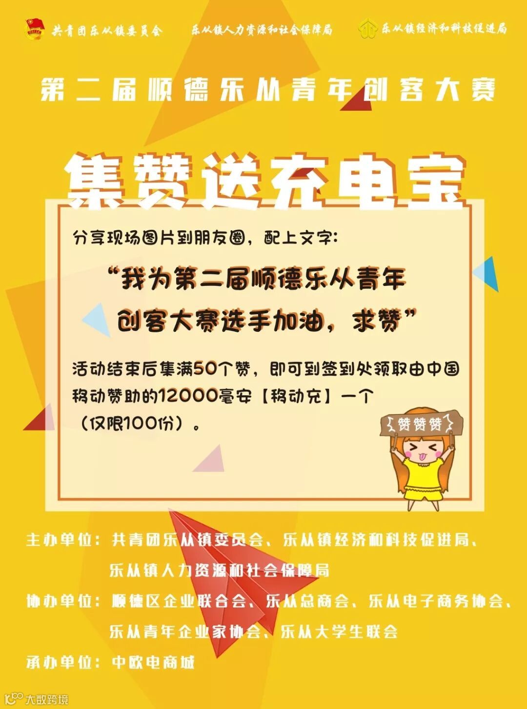 除此之外,到场的青们若将现场赛事图片发到朋友圈并配上文字:“我为第二届顺德乐从青年创客大赛选手加油,求赞”。