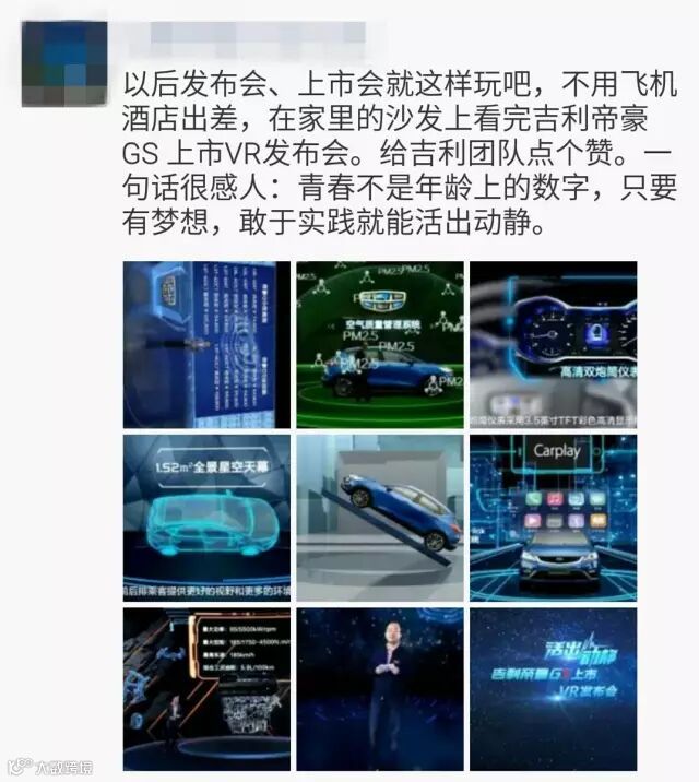 热衷尝鲜,勇于突破的帝豪GS向来是备受关注的焦点,这次也不例外——昨晚上演的VR发布会一度吸引了近1600万人关注,诸多的车友、媒体、白领、大学生,甚至连老外都忍不住加入了这次帝豪GS VR首秀的体验队列,凭借炫酷的虚拟体验,不少小伙伴都因为帝豪GS而拥有了一个科技范儿十足的炫酷之夜!