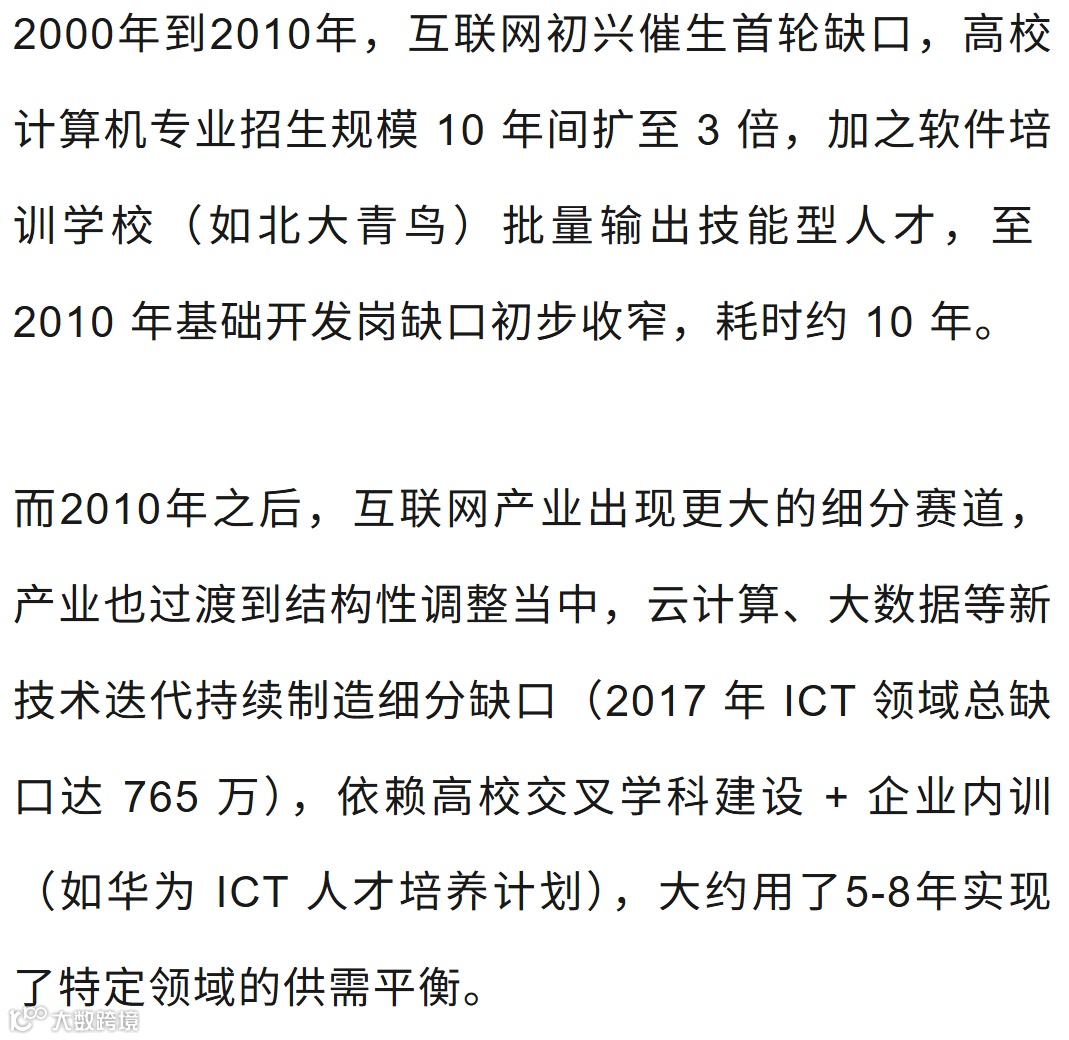 很多人也都在思考,具身智能产业人才缺口多少年才可以达到供需平衡呢?其实,产业上并没有一个标准答案,因为整个产业仍在探索期,技术发展方向和路径,产业规模以及场景落地都不明确。不过,我们依然可以参考互联网产业兴起的相关数据。
