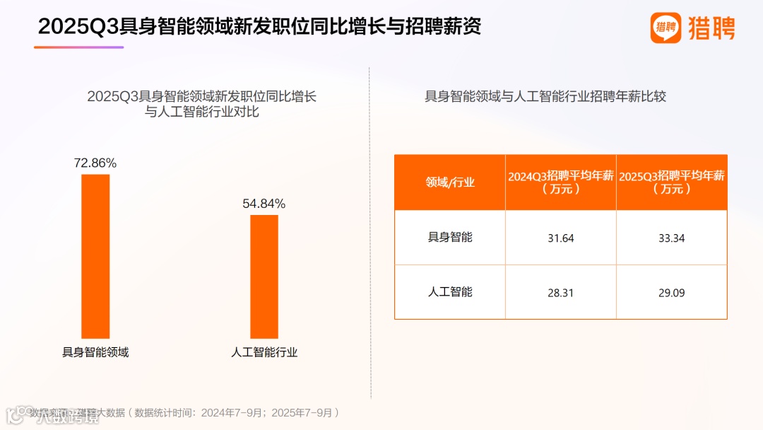 人才市场的热度是产业活力最直接的晴雨表。猎聘最新发布的《2025三季度人才供需洞察报告》显示,2025年三季度具身智能领域新发布职位同比猛增72.86%,这一增速不仅远超同期科技行业平均水平,更比人工智能行业整体增速高出近18个百分点,形成明显的人才需求“虹吸效应”。这也折射具身智能产业的火爆!