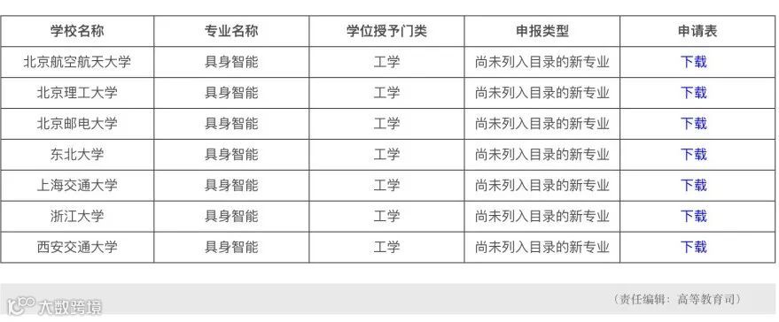 在本科专业设置方面,教育部高等教育司的公告显示,包括北航、北理、北邮等9所高校都在申报具身智能本科专业。此外,同济大学、郑州大学等9所高校也申报增设未来机器人专业。