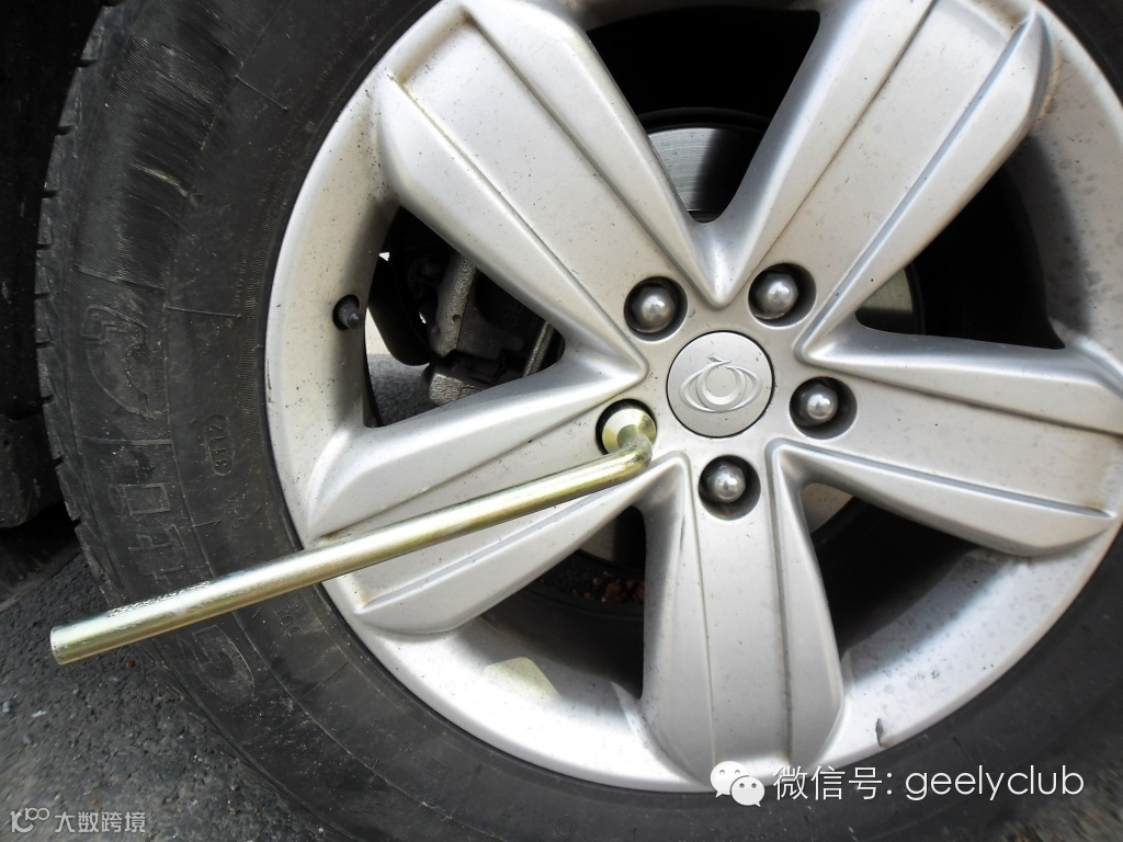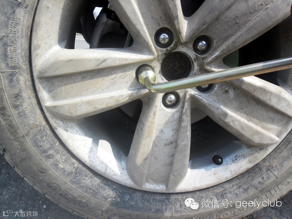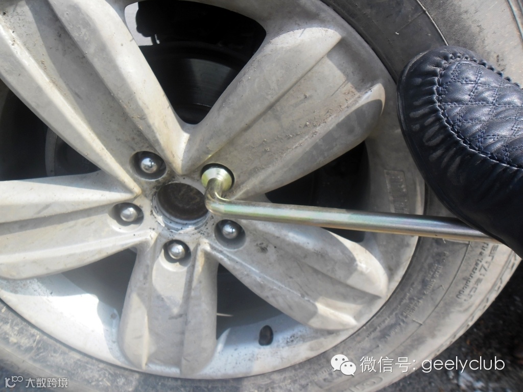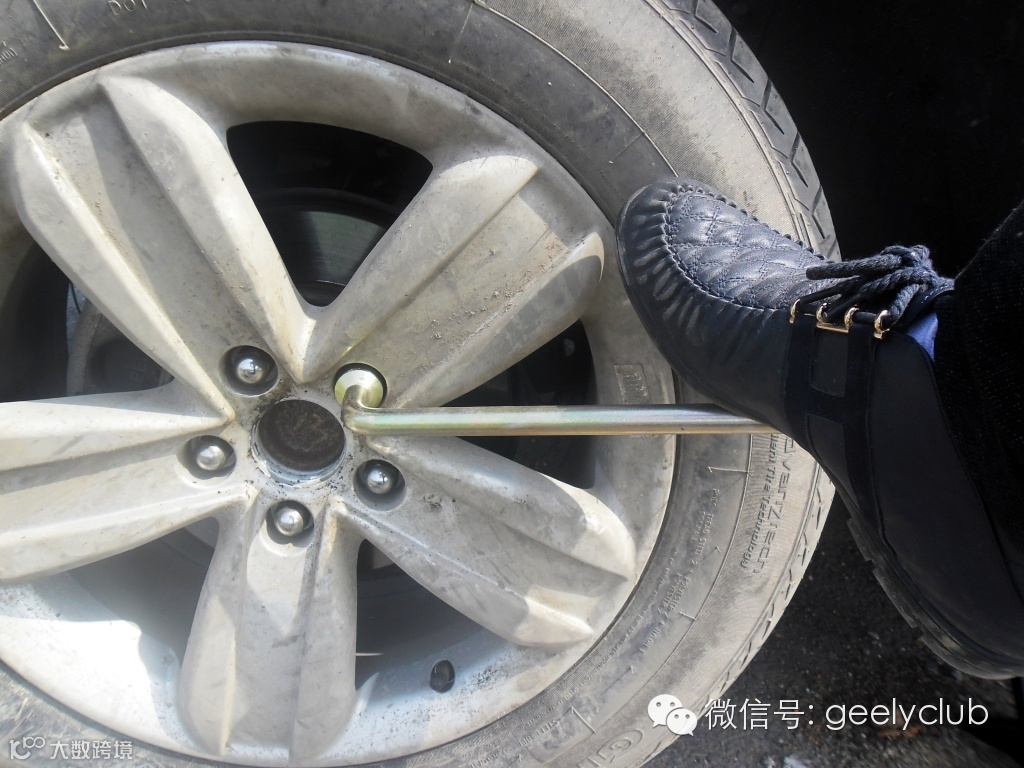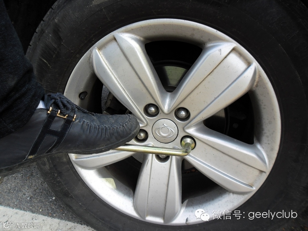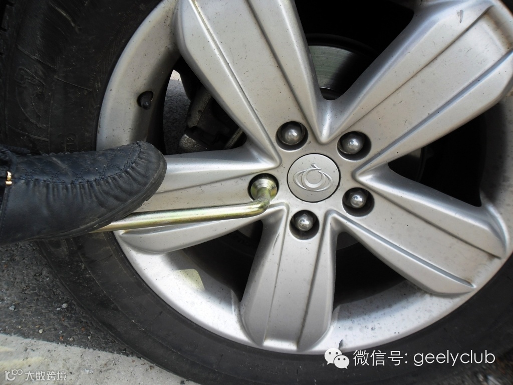 在没把5颗螺丝松一下之前请勿用千斤顶把车子顶起来。先用套筒把螺丝全部松一遍,螺丝太紧的话直接用脚,一般松个一圈就差不多了。