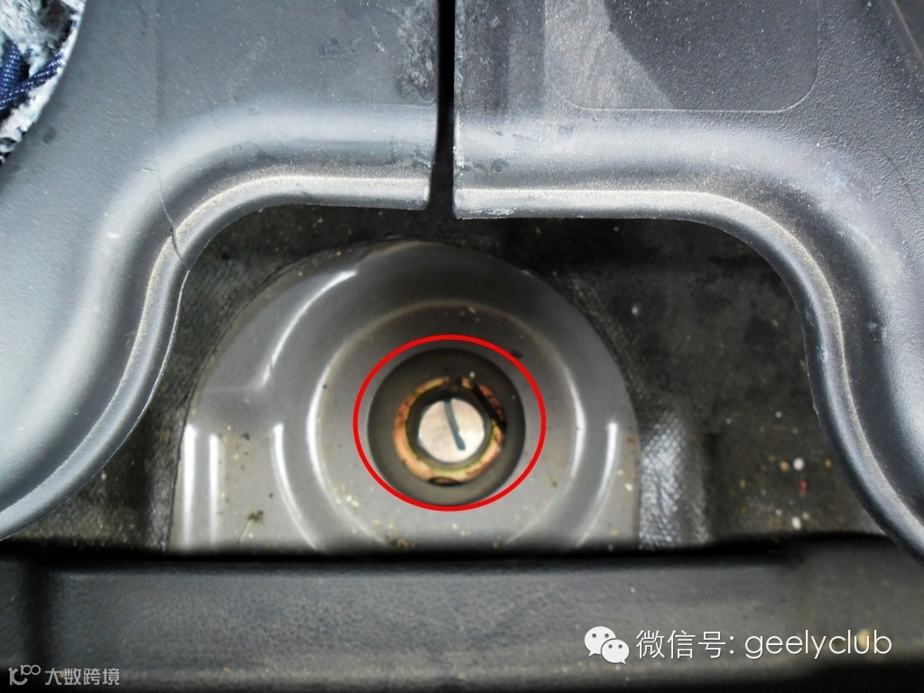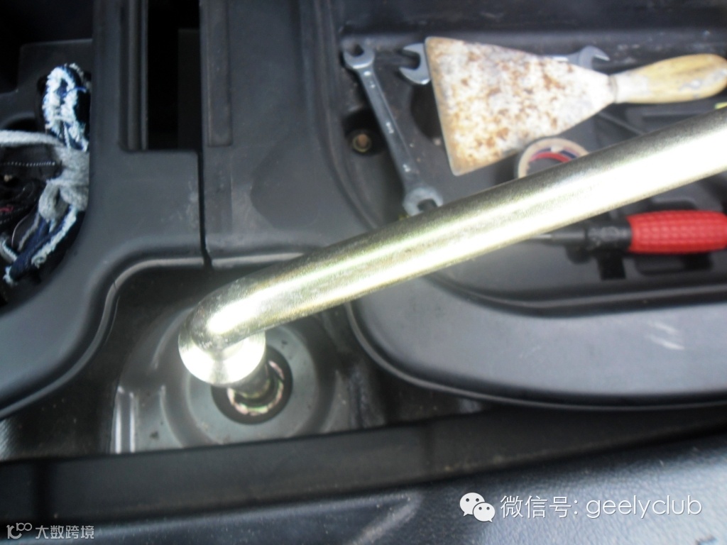 先找到这个点(下图红圈处),就在我们刚刚后备箱拿工具的边上,用较短的那根套筒套在上面,再用那根弯的,也就是卸备胎的套筒套在上面按顺时针转动就可以慢慢把备胎松下来了。