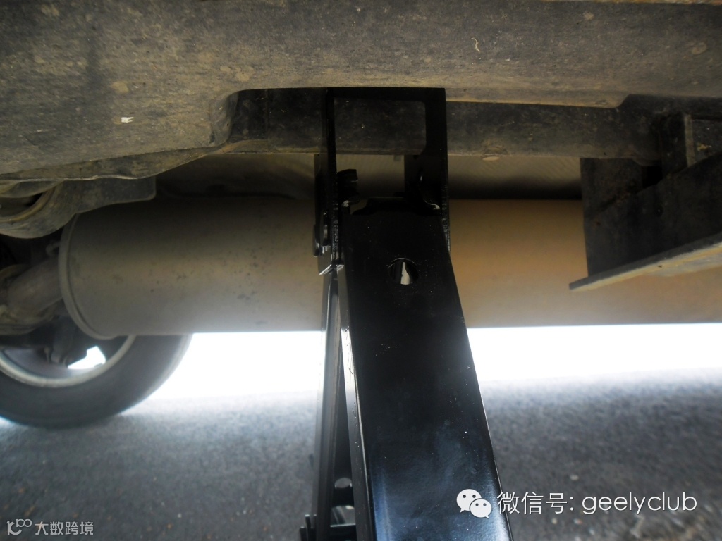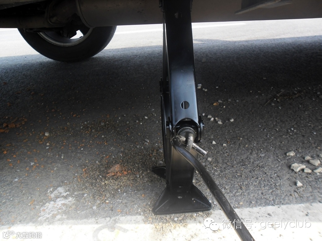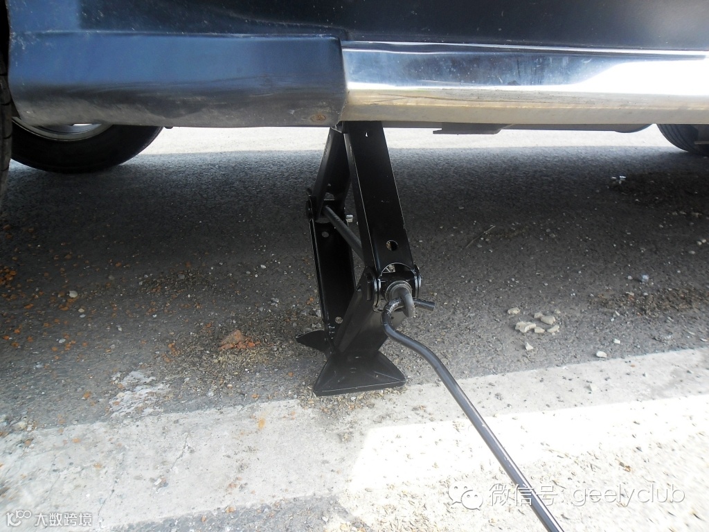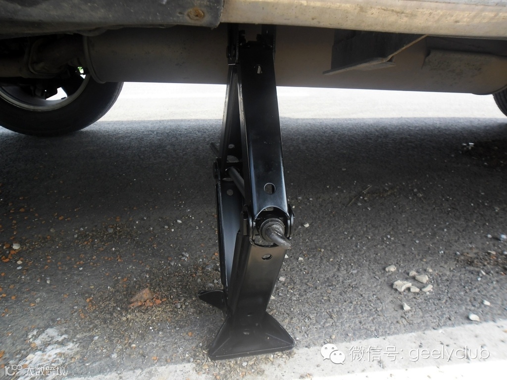 边转动边看千斤顶的卡槽,卡槽一定要对准车子底部的支撑点,一根凸出来的钢条。