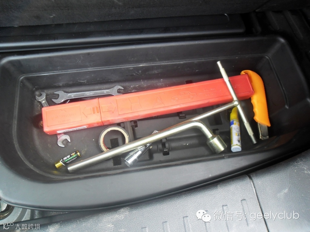 一.后备箱取出需要用到的工具,三脚警示牌,卸轮胎螺丝的套筒和卸备胎套筒以及千斤顶。