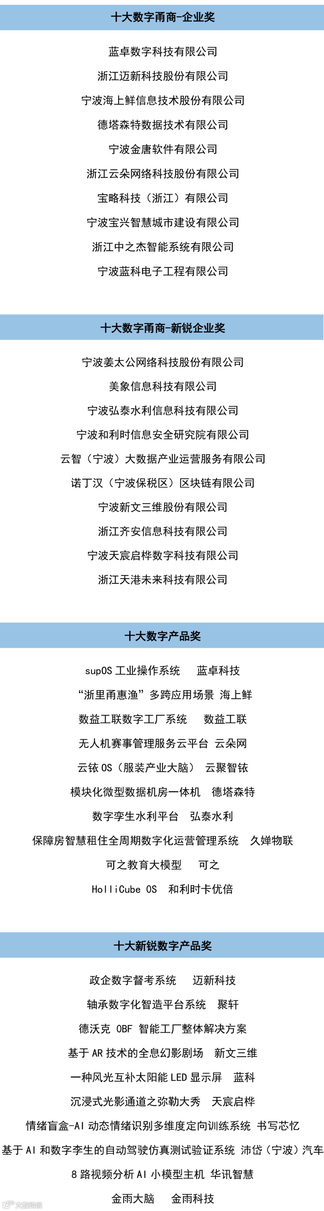 本次数字浙商年会上,还发布了由宁波市元宇宙学会等10家学协会共同评选的“数字甬商”系列榜单(排名不分先后),旨在发挥优秀标杆企业示范效应,引导更多企业加大在数字化转型上的投入,推动实体经济与数字经济深度融合。