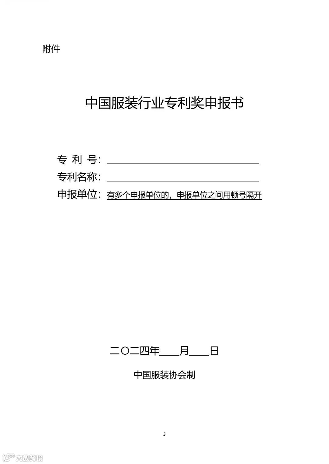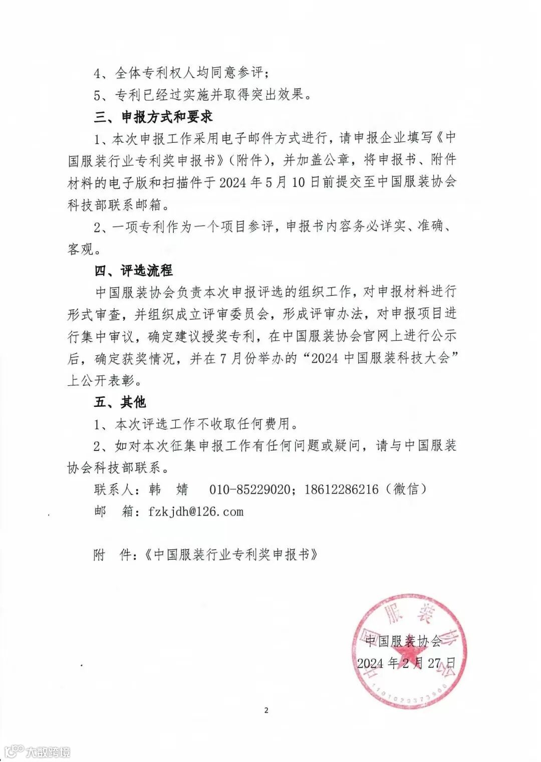 1、本次申报工作采用电子邮件方式进行,请申报企业填写《中国服装行业专利奖申报书》(附件),并加盖公章,将申报书、附件材料的电子版和扫描件于2024年5月10日前提交至中国服装协会科技部联系邮箱。