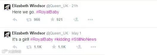 特别好玩的是,自从5月1日凯特王妃入院以来,已经89岁高龄的伊丽莎白二世女王就一直在她的Twitter账号上频繁更新,等待消息,调戏亲家、孙子和英国的人民群众,包括放出假消息... -_-|||