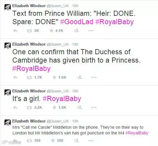 搞笑的女王也在Twitter上转发了威廉王子发来的短信:“继承人:任务完成。备位继承人(备胎):任务完成”,棒小伙!” 随后女王的Twitter页面的主题色换成了粉色。出席接下来的活动还特意挑选了粉色的衣服,人逢喜事精神爽啊: