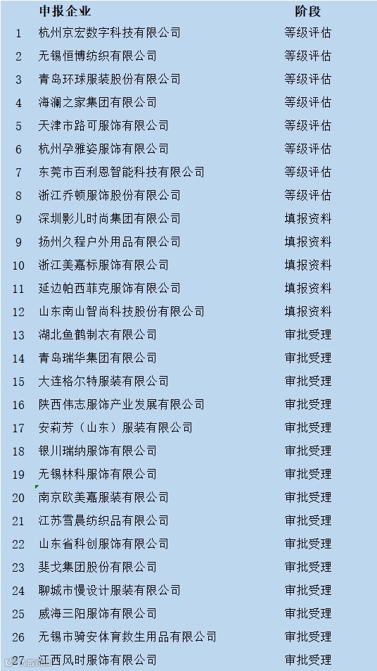 国家工业和信息化部消费品工业司纺织处副处长纵瑞龙,中国服装协会常务副会长、中国服装科创研究院院长、中国服装智能制造联盟工作办公室主任杨金纯为首批认定的8家企业颁发等级认定证书,获得认定的8家企业为:杭州京宏数字科技有限公司、无锡恒博纺织有限公司、青岛环球服装股份有限公司、海澜之家集团有限公司、天津市路可服饰有限公司、杭州孕雅姿服饰有限公司、东莞市百利恩智能科技有限公司、浙江乔顿服饰股份有限公司。