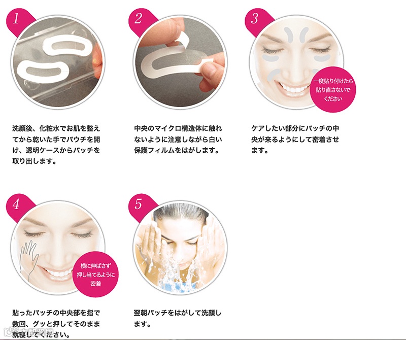 2. 打开面膜,撕开周围的白色保护膜,将透明的微针面膜贴在需要 的部位,如眼角的细纹处,嘴角的法令纹处等;