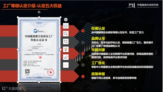 中国服装数字化快反工厂等级认定是由中国服装协会组织开展的,运用规范、统一的评价方法,对服装工厂数字化快反能力进行定量和定性分析,从而对服装工厂的数字化快反能力等级作出真实、客观、公正的综合认定,建立服装行业数字化快反工厂等级划分标准。