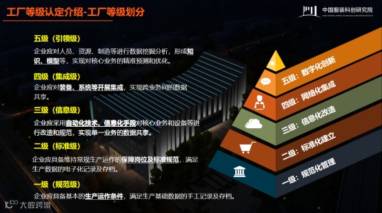 此认定模型是从业务、设计、信息化、制造等要素维度,从低到高分为五个成熟度等级,综合评价服装制造企业的数字化、网络化、智能化发展水平。其中,一级为规范化理(规范级),二级为标准化建立(标准级),三级为信息化改造(信息级),四级为网络化集成(集成级),五级为数字化创新(引领级)。