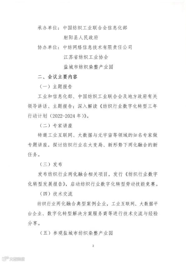 为促进新一代信息技术在纺织行业的深度应用,加快我国纺织行业两化融合步伐,促进纺织行业转型升级和高质量发展,根据工业和信息化部2022纺织服装“优供给促升级”活动和中国纺织工业联合会工作计划,定于2023年3月18日在江苏省盐城市射阳县召开“2022年中国纺织行业两化融合大会”。会议将重点介绍我国纺织行业两化融合现状、趋势与成果,展示和推广以工业互联网、大数据等新一代信息技术与纺织行业相融合的成效。