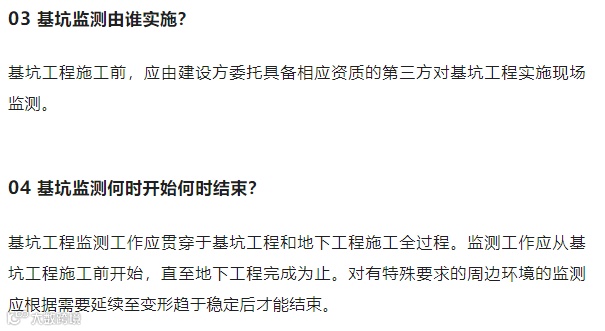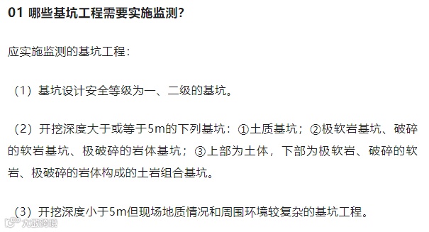一般来说,开挖深度大于等于5m或小于5m但现场地质情况和周围环境较复杂的基坑工程,以及其他需要监测的基坑工程,都应实施