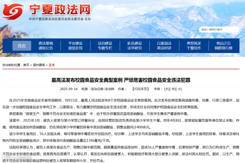 亚硝酸盐中毒事件:2021年,某校外供餐饭店在明知餐饮服务单位禁止使用亚硝酸盐的情况下,仍在给学生供餐的排骨中添加亚硝酸盐,导致56名学生出现头疼、呕吐等中毒症状并住院治疗。检测显示,排骨汤内亚硝酸盐含量高达1396毫克/千克,严重超标。最终,饭店经营者被判处有期徒刑七年。