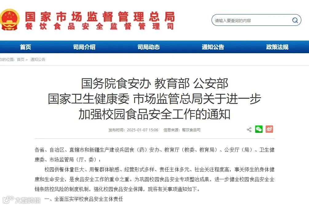 2025年初,国务院食安办联合教育部、公安部、国家卫生健康委、市场监管总局印发《关于进一步加强校园食品安全工作的通知》,明确提出要全面压实学校食品安全主体责任,落实校长(园长)负责制。