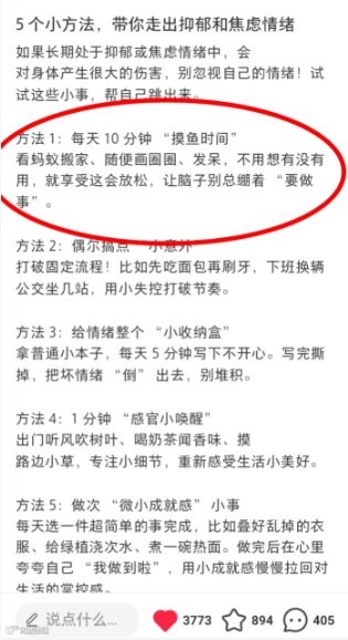 每天10分钟摸鱼时间,看蚂蚁搬家、随便画圈圈、发呆,不用想有没有用,就享受这会放松,让脑子别总绷着“要做事”