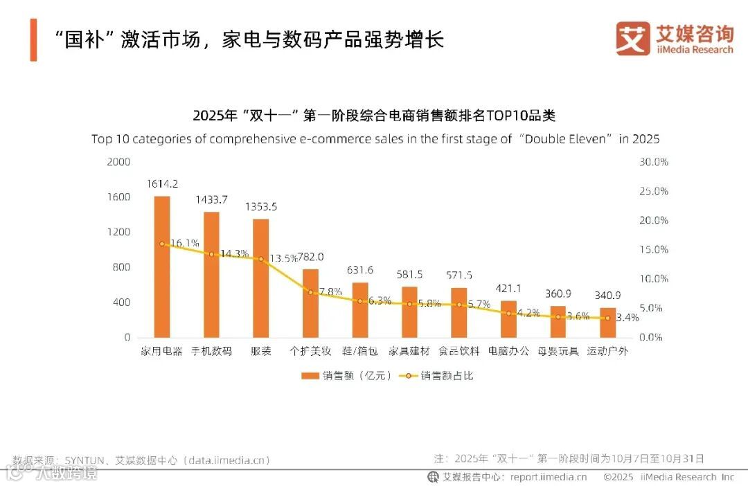 数据显示,家用电器、手机数码、服装是2025年“双十一”第一阶段销售额占比较高的品类,销售额分别为1614.2亿元、1433.7亿元、1353.5亿元。艾媒咨询分析师认为,政府推出的“国补”政策对家电等大宗消费品进行补贴,极大地刺激了消费者的购买欲望。市场经济的恢复和消费者对生活品质的追求,推动了手机数码及服装的销售增长。