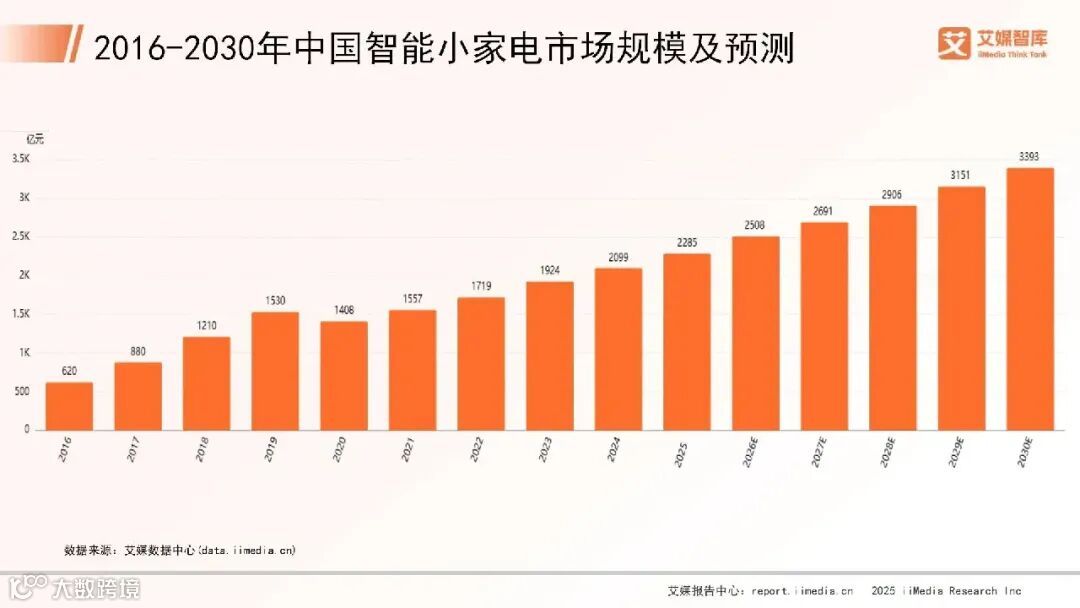 iiMedia Research(艾媒咨询)数据显示,2016-2030年中国智能小家电市场规模持续增长,从2016年620亿元起步,至2025年市场规模达到2285亿元,预计2030年将进一步增长至3393亿元。随着居民生活水平提升、消费观念转变,以及技术不断革新,智能小家电市场前景广阔,有望在未来持续拓展品类、提升智能化程度,满足消费者对便捷、健康、高品质生活的追求。