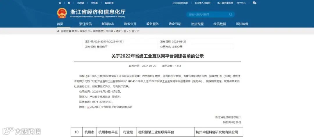 8月29日,浙江省经济和信息化厅发布了《关于2022年省级工业互联网平台创建名单的公示》,中国服装科创研究院作为运营主体的橙织服装工业互联网平台成功入选。