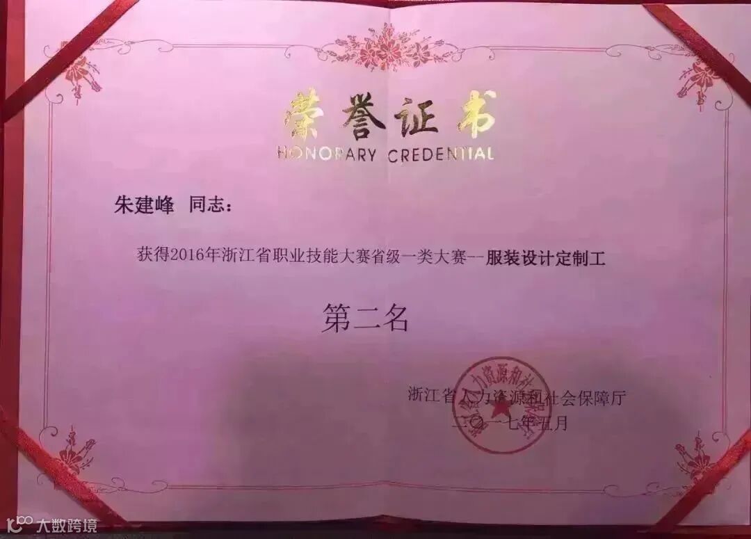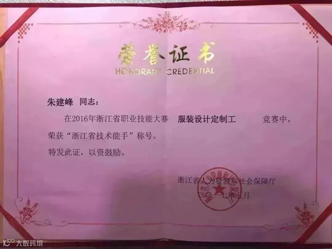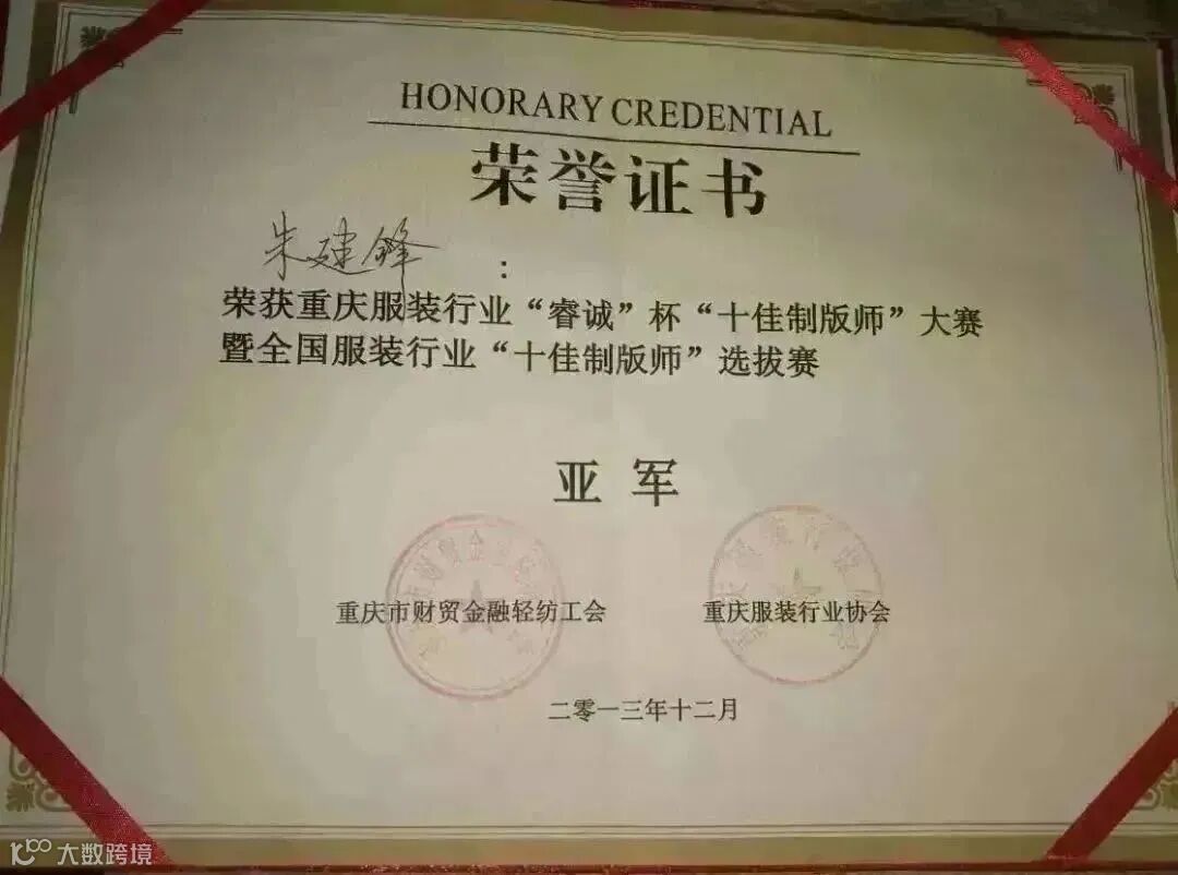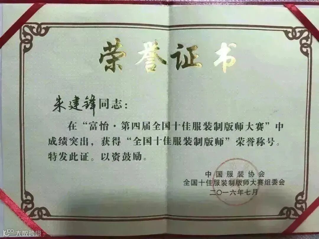 朱建锋,国家职业技能鉴定考评员。从事服装工作20年。先后效力于红豆集团、睿城集团、意大利YITI、安歌利亚、红袖集团等等
