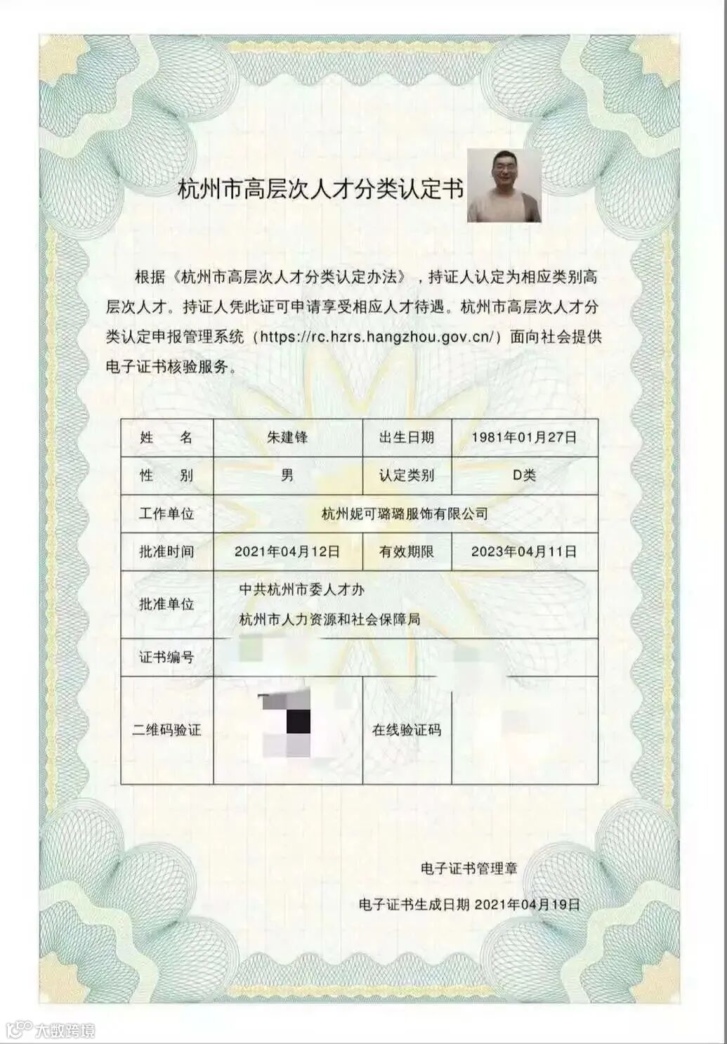 2020年获杭州市余杭区高层次人才分类认定书C类人才认定。