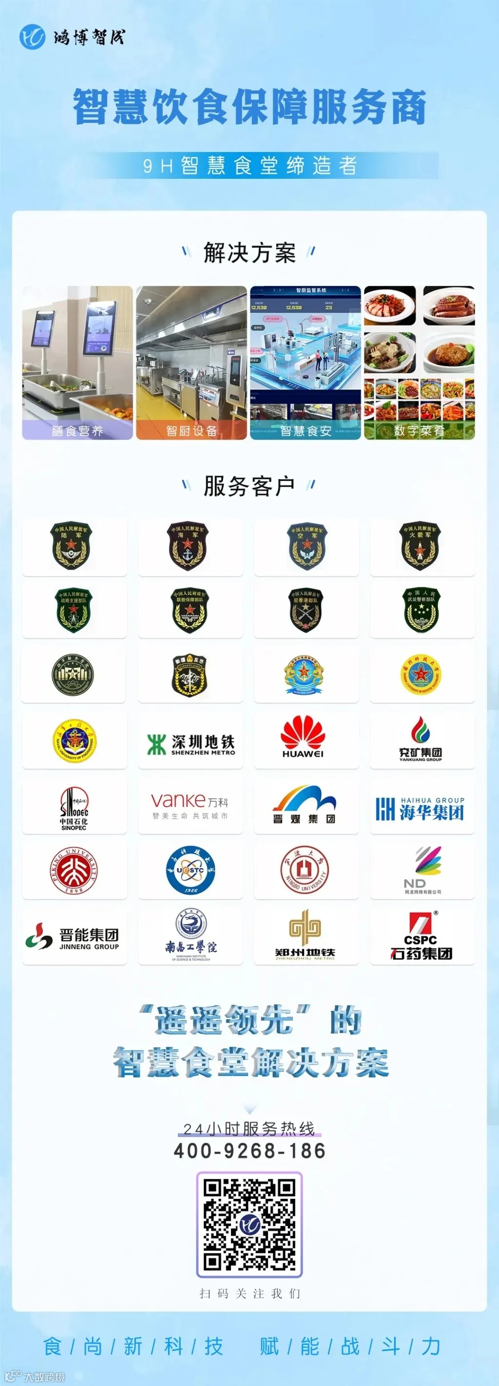 其中,“9H智慧食堂”解决方案以中餐标准化为核心,为众多行业客户提供高效、健康、安全、节约、人性的用餐体验,赢得了良好的社会及经济效益。鸿博智成的用户遍布全国各大城市,包括部队、监所、医院、学校、企事业单位等,为社会餐饮领域树立了创新标杆。