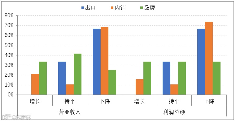 从业务类型来看,品牌企业效益状况明显好于制造企业,营业收入和利润总额保持增长和持平的品牌企业占比高于制造型企业。在制造型企业中,七成左右的企业营业收入和利润总额均有所下降,2/3的出口企业效益下滑,营业收入和利润总额下降的内销型制造企业占比分别达到68.4%和73.7%。