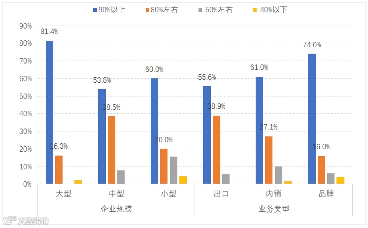 从业务类型来看,品牌企业开工率明显高于制造型企业。品牌企业开工率达到90%的企业占74%,而制造型企业开工率达到90%的企业仅占59.7%,低于品牌企业14.3个百分点;在制造企业中,以内销为主的企业开工率达到90%的企业占61%,27.1%的内销企业开工率在80%左右,以出口为主的企业开工率达到90%的企业占55.6%,38.9%的出口企业开工率在80%左右。