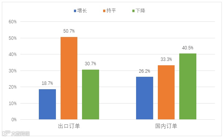 企业普遍反映订单不饱和,订单数量下降的企业明显多于订单增长的企业,内销订单下降趋势更为明显。内销订单方面,26.2%的企业订单增长,33.3%的企业订单数量基本持平,40.5%的企业订单数量下降,18.3%的企业表示订单同比下降超过20%;出口订单方面,18.7%的企业订单增长,50.7%的企业订单数量基本持平,30.7%的企业订单数量下降,14.7%的企业订单同比下降超过20%。从企业在手订单情况来看,55.6%的企业有相对稳定、持续的订单来源,其中27%的企业在手订单可以支持3个月以上的生产,17.4%的企业订单可以支持1个月左右的生产。