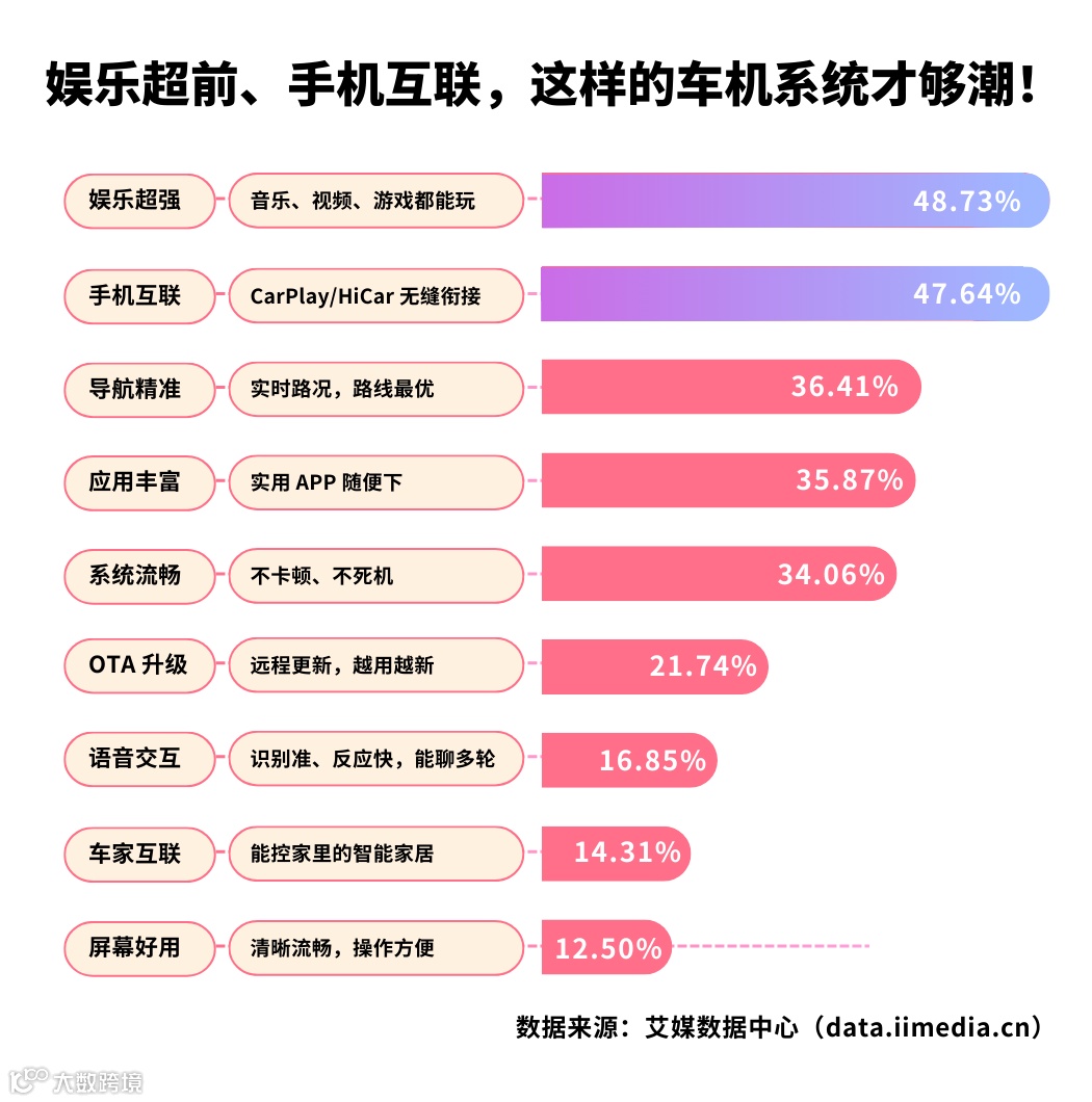 除却人性化设计,丰富的交互功能也能使驾驶更具乐趣。车机系统的娱乐功能(48.73%)不能弱,能与手机互联(47.64%)才能解决更多琐碎需求,导航当然也要精准,毕竟“梦中情车”肯定要把乘客顺利送到每个目的地~