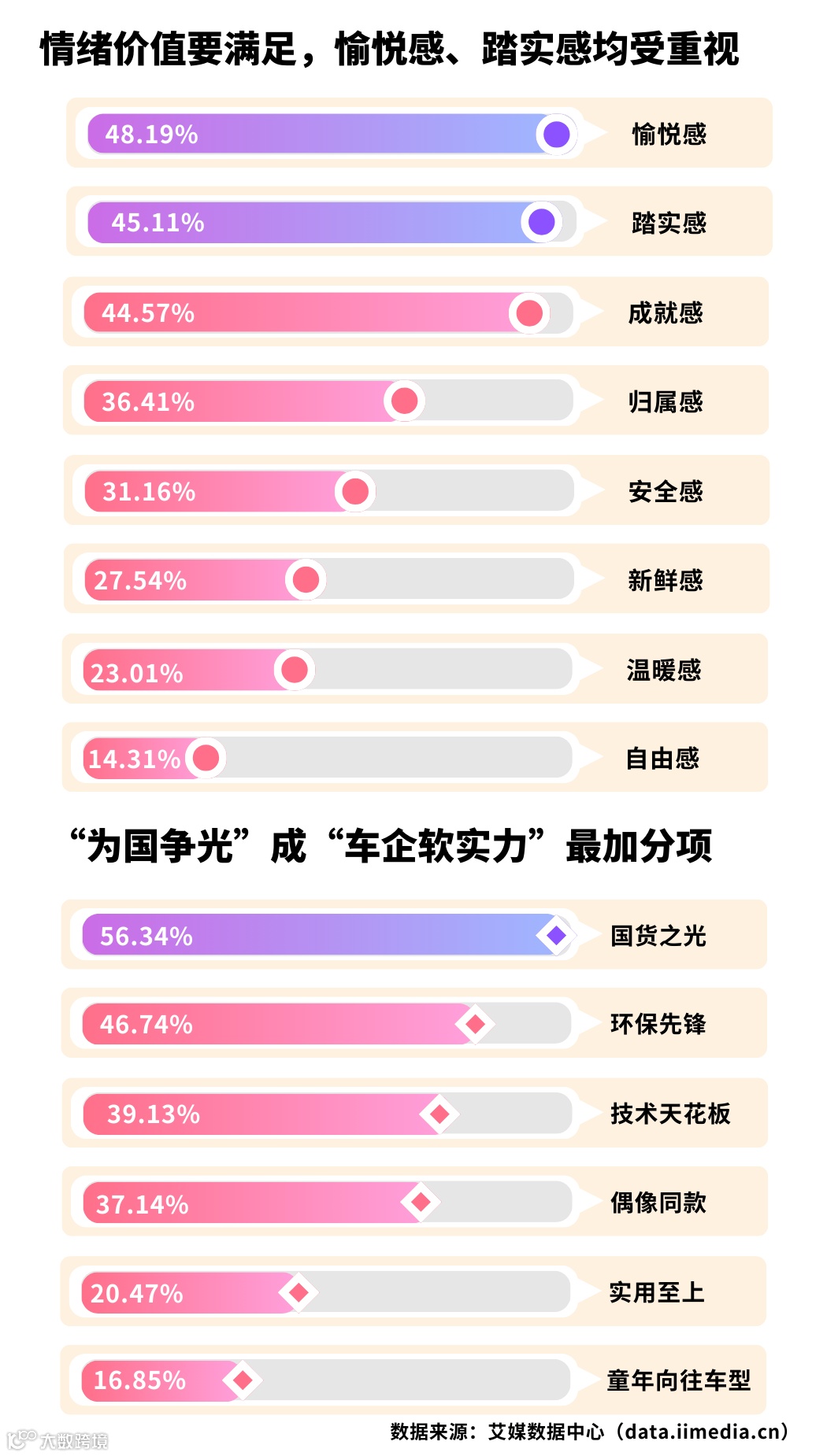 除却硬指标,软实力也在悄悄影响大家的决策,更多人开始注重汽车除出行工具之外其他的附加价值,“为情绪买单”也出现在了人们选车时的决策因素中,愉悦感、踏实感和成就感成为了人们希望能从车中获得的情绪价值,国货情怀(56.34%)成为最加分的选项,偶像同款(37.14%)和童年白月光(16.85%)虽相对技术、环保等占据份额较小,但清晰地折射出了人们愈加丰富的需求。