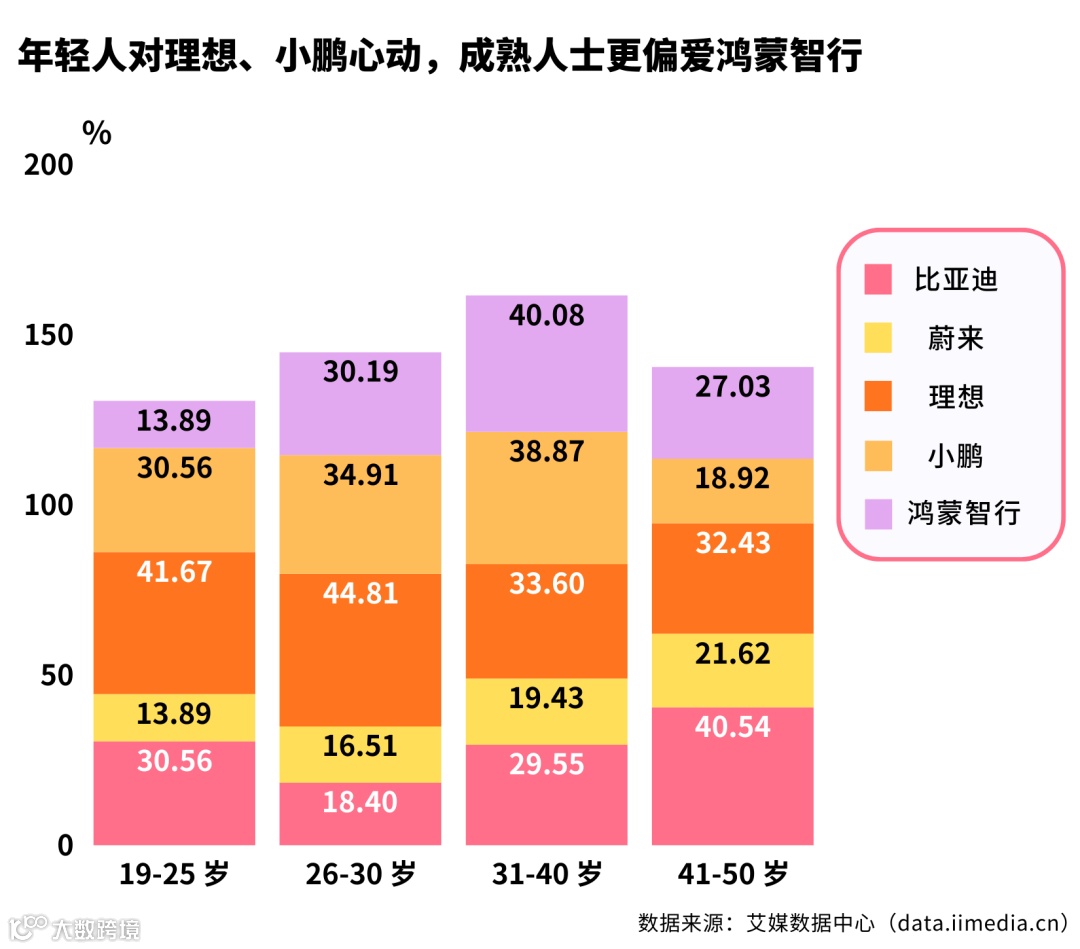 中国品牌声名鹊起,传统转型车企、跨界品牌、新型企业层出不穷。在19-30岁消费者中,理想和小鹏最受欢迎,力压一众国外品牌;31-40岁的消费者则更加偏爱鸿蒙智行,问界M9成为成熟人士的偏好的座驾。
