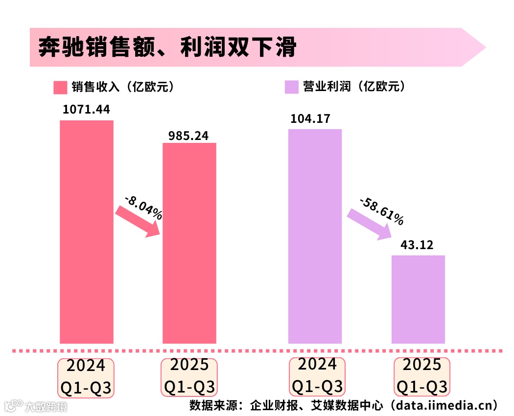 国产品牌迅猛的发展态势从近年的销售情况也可见一斑。2025年前三季度奔驰销售收入为1071.44亿欧元,同比下滑8.04%;营业利润为43.12亿欧元,同比下滑58.61%。[2]与此相对的是,赛力斯2025年1-9月总营收达1105.34亿元,净利润53.12亿元,同比增长31.56%。[3]