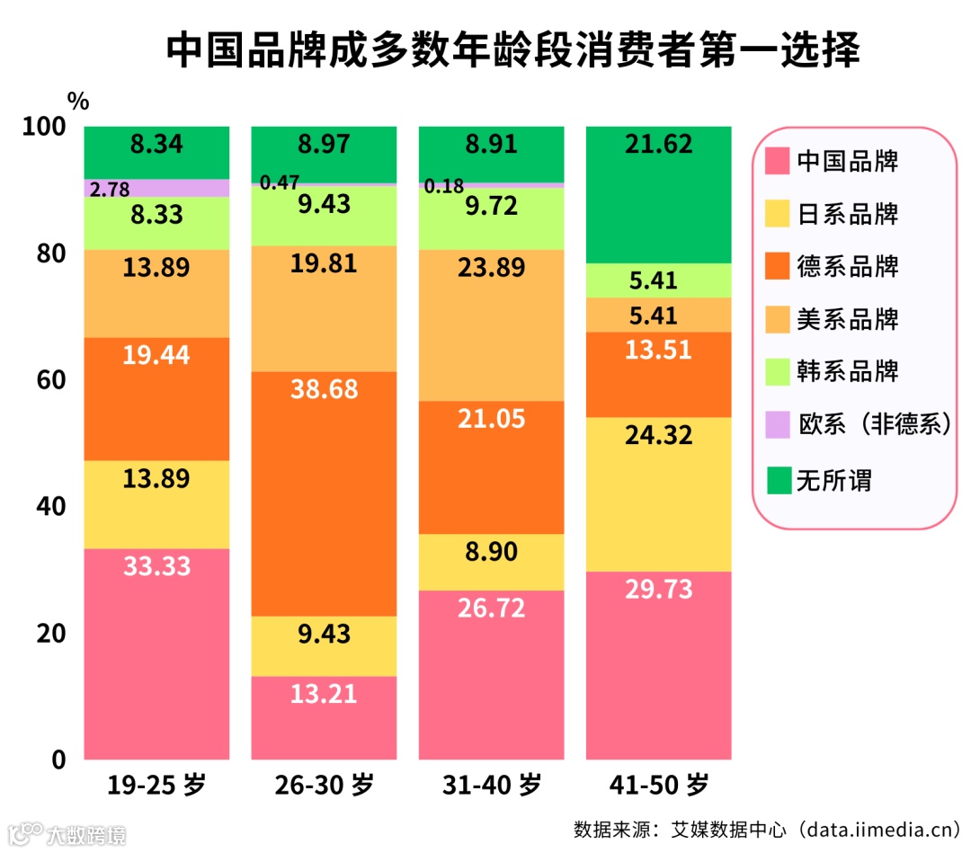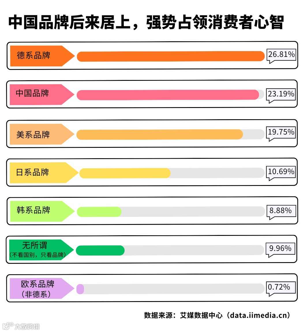 车流中的logo愈发多样,抢占市场的前提是实力够硬。中国品牌虽起步较晚,但已超越美日韩,以23.19%的占比铸牢了在消费者心中的印象,更是在00后与30岁以上的年龄段中占据首位,成功超越一众起步早、发展时间长的国外品牌。德系品牌(26.81%)则以长久以来搭建的“安全”“硬核”等标签,以成熟的产业发展占据较多市场,受26-30岁年龄段人群青睐。