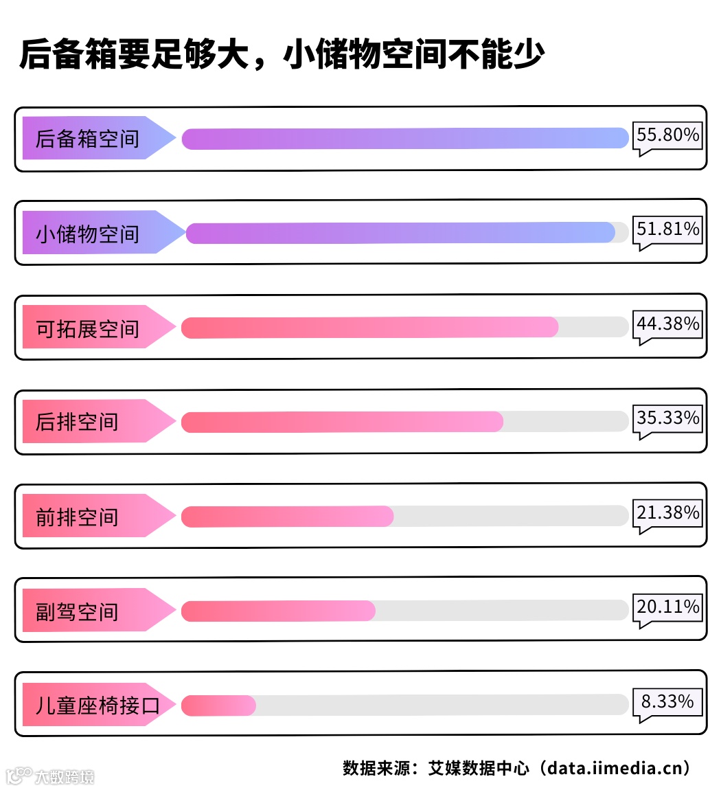 好车当然要“能装”,后备箱空间(55.80%)要能将所需一切打包带走,车上触手可及的小储物空间(51.81%)也得能装下随身物品。萌娃的奶瓶、精致女性的包包、打工人必备的咖啡……都需要有恰到好处的摆放位置。