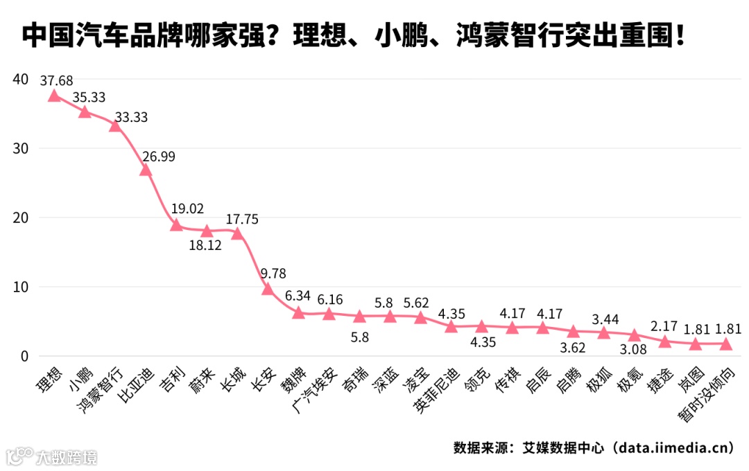 国产领军车企更是已经拥有与BBA等传统品牌的一战之力。理想(37.68%)、小鹏(35.33%)、鸿蒙智行(33.33%)等凭借短短几年就已受到认可,超越本田、现代等车企,与奥迪、奔驰等声名远扬的品牌分庭抗礼。