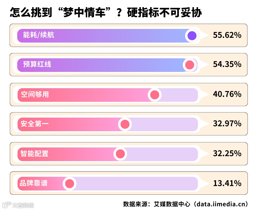 新车年年有,硬指标雷打不动。55.62%认为能耗续航问题不可妥协,预算问题(54.35%)也是“该省省该花花”的中国消费者考量中不可忽视的一部分,钱要花在刀刃上,不管是购车还是补能都要拉满性价比。