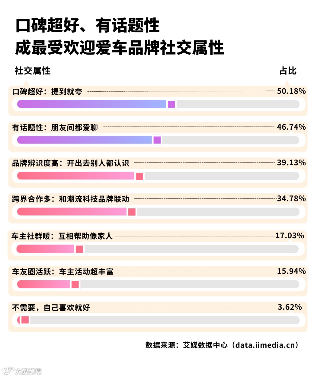 汽车品牌的社交属性也受到期待,口碑超好(50.18%)的品牌,让车主与人聊天更能骄傲地提起爱车,品牌有话题性(46.74%)也能在茶余饭后多一个朋友间的谈资。要辨识度高、也要多跨界合作,“做好一台车”的意义,在当下已超越了“做一台好车”。