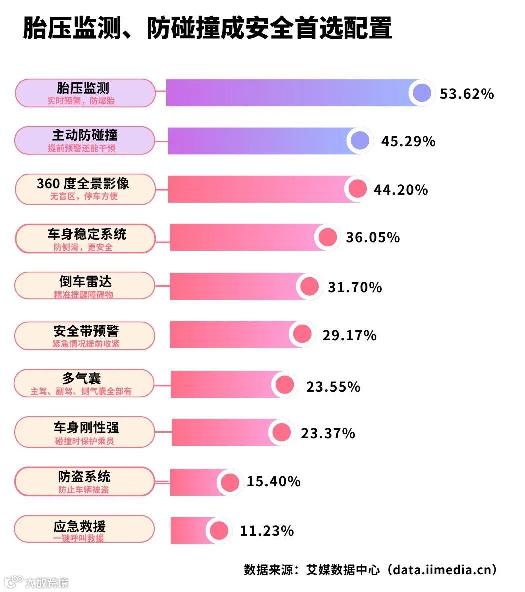 不论是日常通勤还是短途自驾,安全永远是第一位。在安全配置上,53.62%消费者认为“胎压监测”必不可少,45.29%期待“主动防碰撞”全景影像、车身稳定也被纳入考虑。安全问题,势在必行。