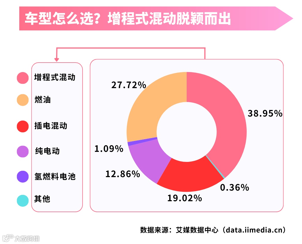 近年来,新能源乘技术东风一路高歌猛进,以日新月异的面貌不断抢占市场,消费者的选择也愈加多样。燃油车(27.72%消费者选择)技术成熟动力足,但钱包跟不上油费上涨的步伐,纯电车(12.86%)虽省钱,却难以处理北方冬天亏电的问题。增程式混动脱颖而出,成为近四成(38.95%)消费者最青睐的动力类型。