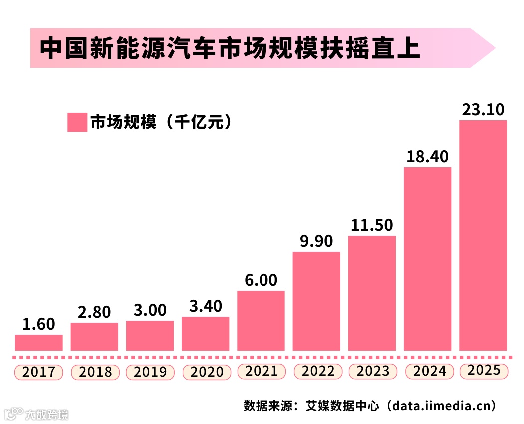 iiMedia Research(艾媒咨询)发布的《2025年中国新能源汽车行业发展状况与消费行为调查数据》显示,中国新能源汽车市场规模从2017年到2024年逐年上升,2024年中国新能源汽车市场规模为18.40千亿元,同比增长60.00%,2025年达到23.10千亿元。借着政策东风,新能源汽车凭借捂紧荷包的优势和技术的进步,抓住了当代消费者的心。