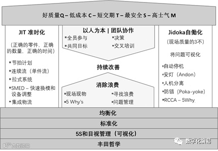 “两大支柱”,即自働化(Jidoka)和准时化(Just-in-Time)等支撑工具。具体来说,自働化包括现场制造质量的“三不”(不接受缺陷、不制造缺陷和不传递缺陷)、自动停机、安灯(Andon)、防错(Poka-yoke)、根因分析RCCA的五个为什么,准时化则包括节拍计划、单件流(Single Piece Flow,SPF)、拉式系统、SMED快速的工装换模和设备调整、集成物流,等等。