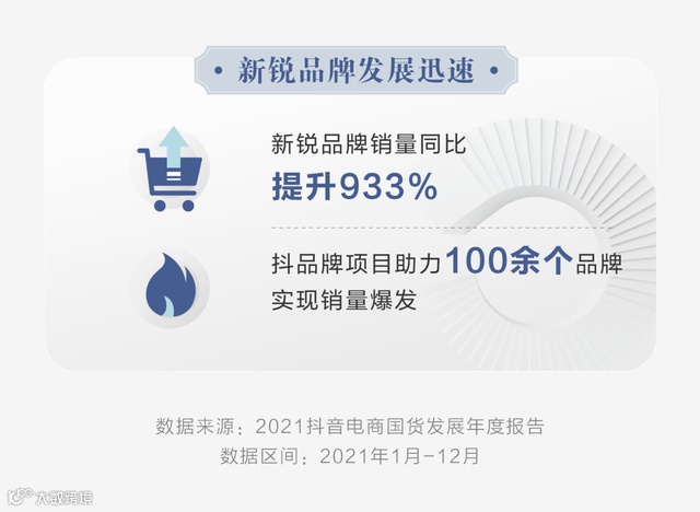 报告显示,新锐品牌销量同比提升933%。新锐品牌不断开展创新,高颜值、高性价比成为关键卖点。抖品牌项目助力100余个品牌销量实现爆发。