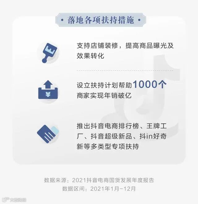 同时,抖音电商落地各项扶持措施,设立扶持计划帮助1000个商家实现年销破亿元,通过抖音电商排行榜、王牌工厂等活动和项目,助力国货品牌发展。
