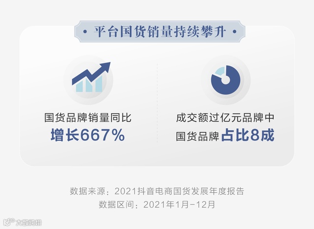 1月6日,抖音电商发布《2021抖音电商国货发展年度报告》(下称报告)。报告显示,2021年,抖音电商国货品牌销量同比增长667%。平台持续加强国货品牌扶持力度,提升售后保障服务水平,满足了消费者多样化品质购物需求,国货品牌借助平台实现飞速发展。